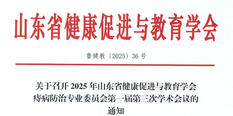 各相关单位:为交流和研讨痔病防治新技术、新方法,助力提升居民健康水平,经研究,定于9月14月在济南市召开2025年山东省健康促进与教育学会痔病防治专业委员会第一届第三次学术会议。现将有关事项通知如下:关于召开山东省健康促进与教育学会2025年痔病防治专委会年会的通知.docx关于召开2025年山东省健康促进与教育学会痔病防治专委会年会的通知.pdf