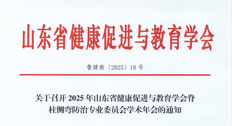 各相关单位:为深入贯彻新时期卫生与健康工作方针和《“健康山东2030”规划纲要》要求,进一步加强脊柱侧弯防治与健康科普工作,提升公众脊柱健康意识,推动青少年脊柱健康管理体系建设,助力健康山东行动,经研究,定于6月下旬在济南市召开2025年山东省健康促进与教育学会脊柱侧弯防治专业委员会学术年会。现将有关事项通知如下:关于召开2025年山东省健康促进与教育学会脊柱侧弯防治专业委员会学术年会的通知(5.