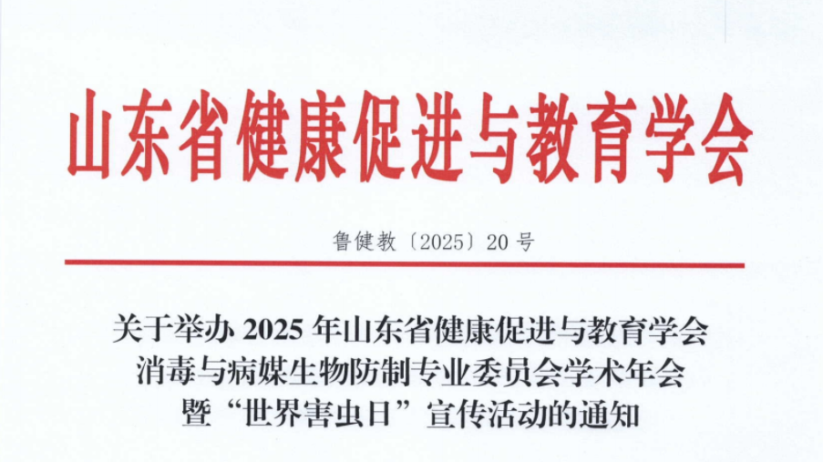 各相关单位:2025年6月6日是第9个“世界害虫日”,主题口号“绿色虫控,健康家园”。为进一步普及消毒与病媒生物防制科学知识,总结交流消毒与病媒生物防制工作经验,促进全省消毒与病媒生物防制工作。经研究,定于6月上旬在聊城市举办2025年消毒与病媒生物防制专业委员会学术年会暨“世界害虫日”宣传活动。现将有关事项通知如下:关于举办2025年消毒与病媒生物防制专业委员会学术年会暨“世界害虫日”宣传活动的