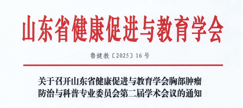 各相关单位:为全面落实健康中国行动相关要求,推动健康山东建设,持续完善构建胸部肿瘤防治平台,提升公众健康素养水平。经研究,定于2025年6月中旬召开山东省健康促进与教育学会胸部肿瘤防治与科普专业委员会第二届学术会议,现将有关事宜通知如下:关于召开山东省健康促进与教育学会胸部肿瘤防治与科普专业委员会第二届学术会议会议通知.docx