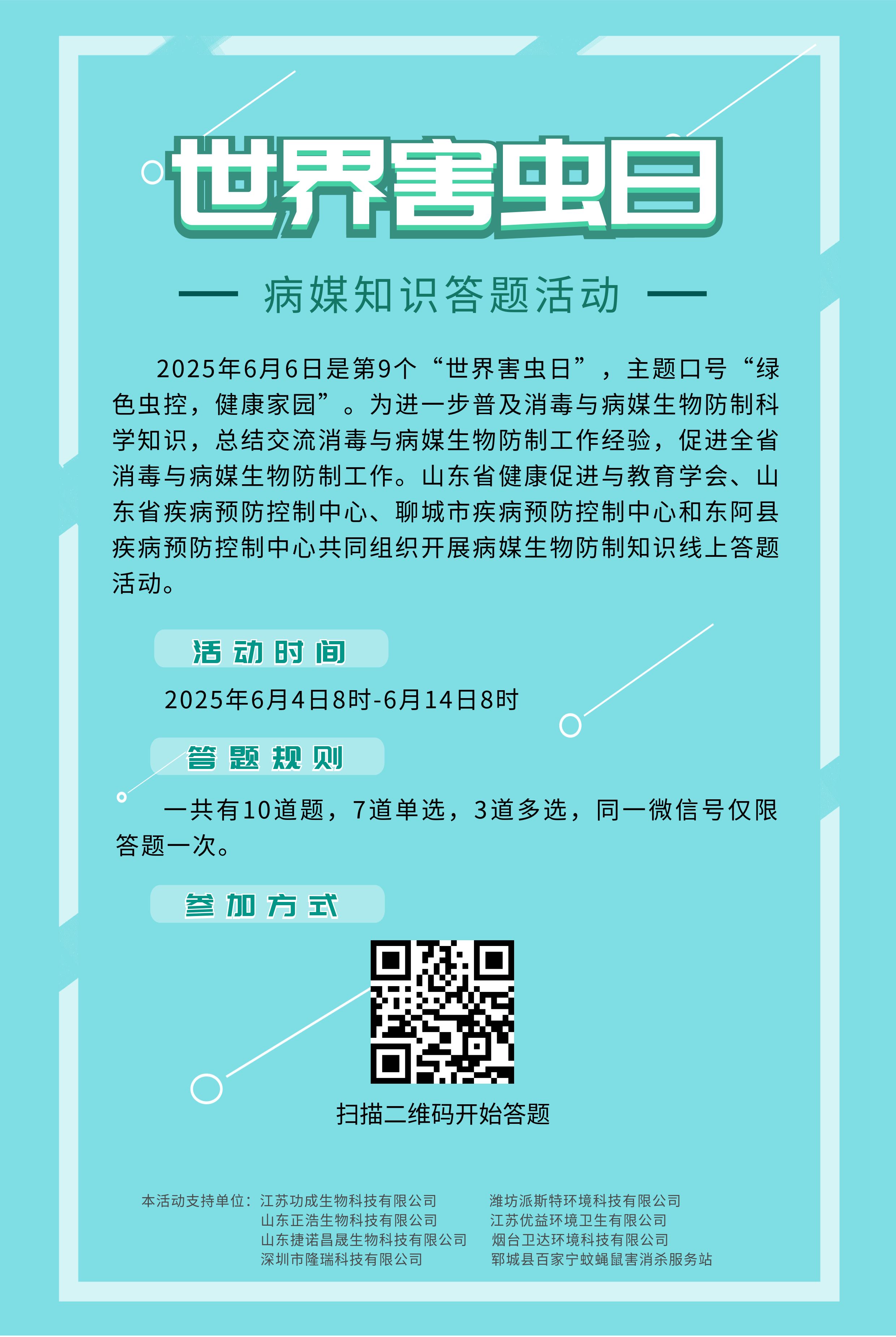 2025年6月6日是第9个“世界害虫日”,主题口号“绿色虫控,健康家园”。为进一步普及消毒与病媒生物防制科学知识,总结交流消毒与病媒生物防制工作经验,促进全省消毒与病媒生物防制工作。山东省健康促进与教育学会、山东省疾病预防控制中心、聊城市疾病预防控制中心和东阿县疾病预防控制中心共同组织开展病媒生物防制知识线上答题活动。
