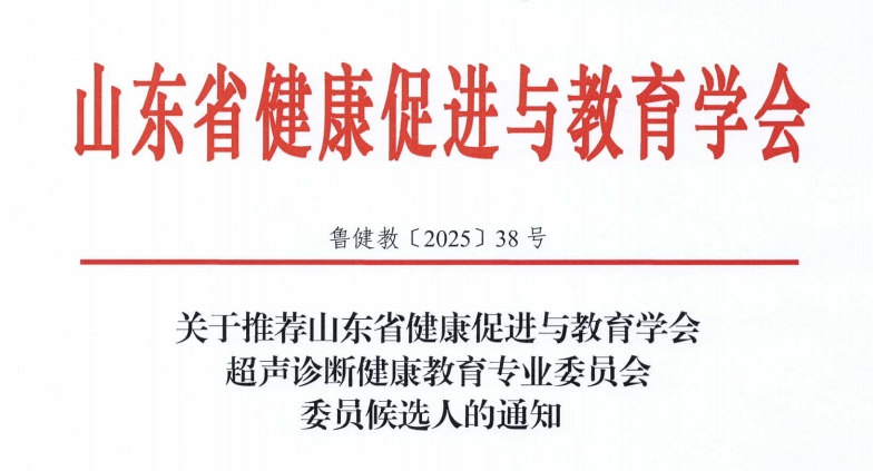 各有关单位:为全面落实健康中国行动相关要求,推动健康山东建设,促进我省健康教育事业发展,提高我省超声医学的专业水平,经研究,拟成立山东省健康促进与教育学会超声诊断健康教育专业委员会,并向全省征集委员候选人,现将有关事宜通知如下:关于推荐山东省健康促进与教育学会超声诊断健康教育专业委员会委员候选人的通知.pdf关于推荐山东省健康促进与教育学会超声诊断健康教育专业委员会委员候选人的通知.docx