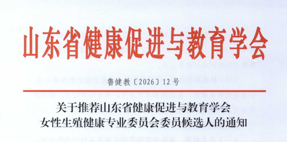 各有关单位:为推进女性生殖健康教育工作,提升女性全生命周期健康保障水平,经研究,拟成立山东省健康促进与教育学会女性生殖健康专业委员会,现将委员候选人推荐工作有关事宜通知如下:关于推荐山东省健康促进与教育学会女性生殖健康专业委员会委员候选人的通知(1).doc关于推荐山东省健康促进与教育学会女性生殖健康专业委员会委员候选人的通知(2).pdf