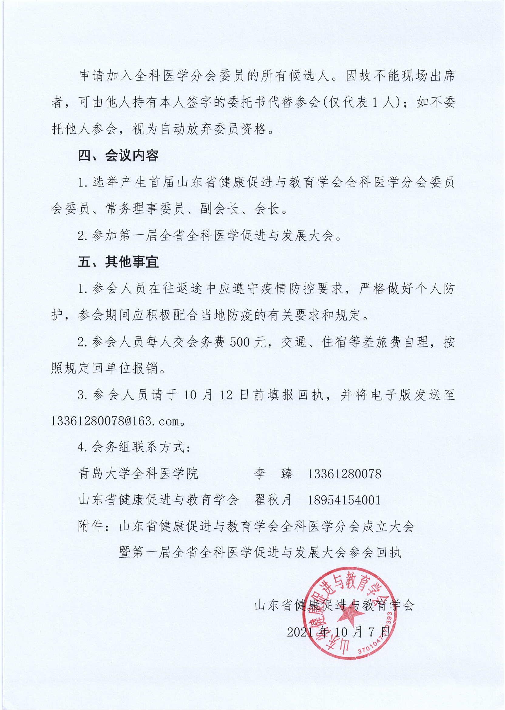 为进一步推进健康中国行动,加强社区医院(门诊)全科医生和乡村全科医生队伍建设,促进医养康养相结合,实施中医药振兴发展重大工程,推动中医药事业和产业高质量发展。经研究定于10月下旬在青岛市召开山东省健康促进与教育学会全科医学分会成立大会暨第一届全省全科医学促进与发展大会。现将有关事项通知如下: