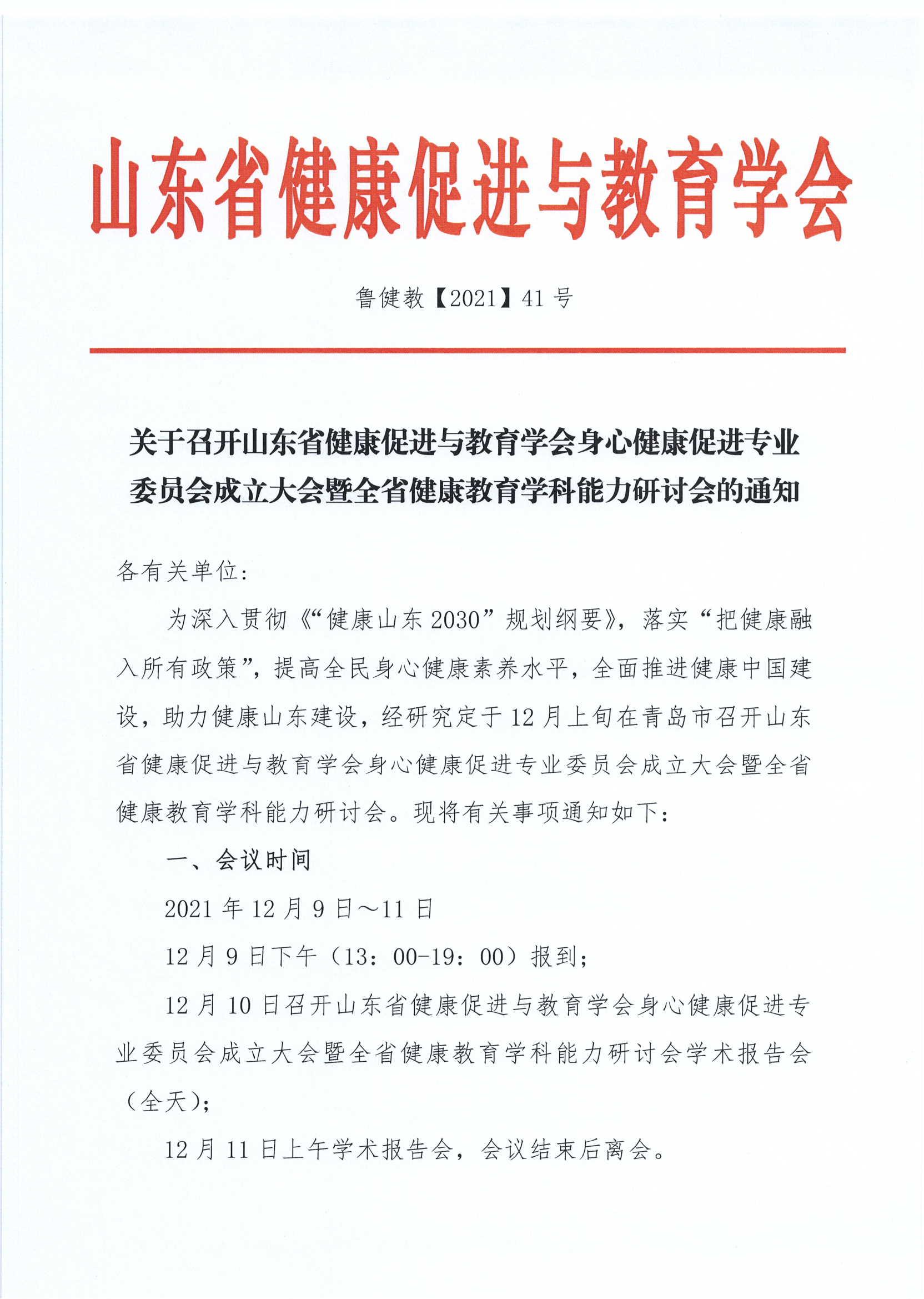 为深入贯彻《“健康山东2030”规划纲要》,落实“把健康融入所有政策",提高全民身心健康素养水平,全面推进健康中国建设,助力健康山东建设,经研究定于12月上旬在青岛市召开山东省健康促进与教育学会身心健康促进专业委员会成立大会暨全省健康教育学科能力研讨会。现将有关事项通知如下: