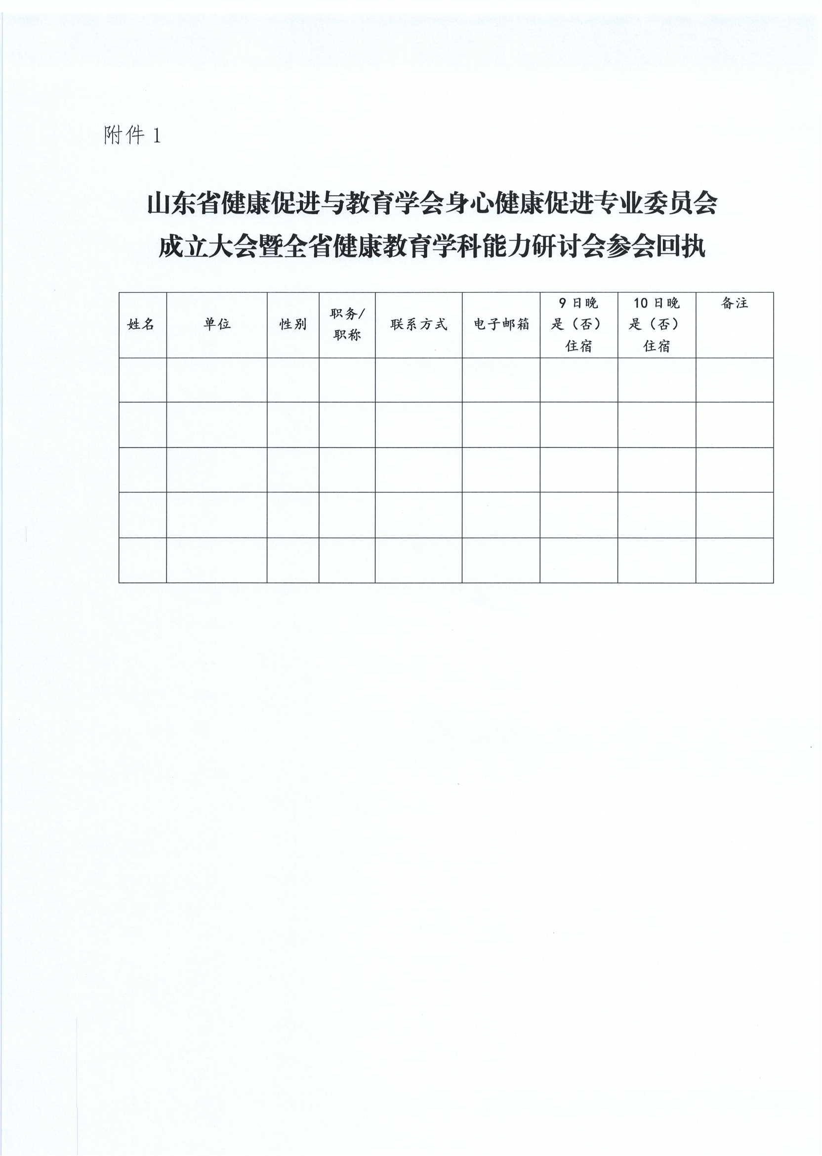 附件1:山东省健康促进与教育学会身心健康促进专业委员会成立大会暨全省健康教育学科能力研讨会参会回执