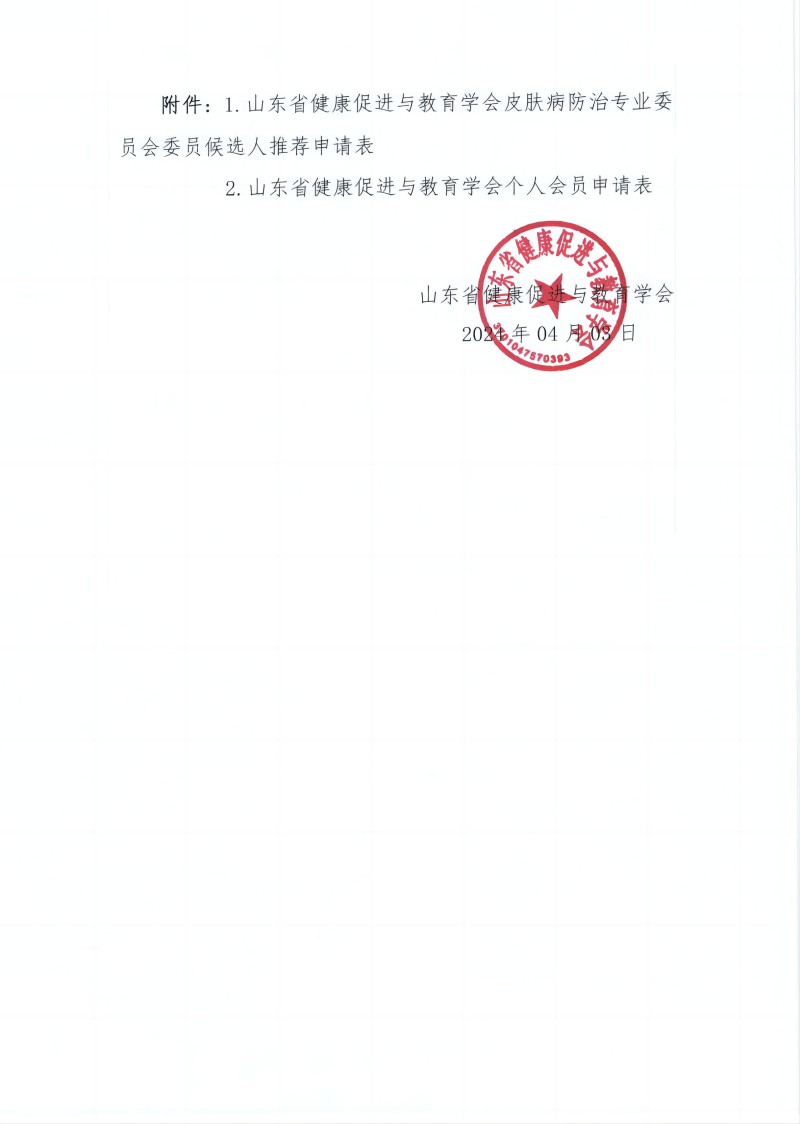 为贯彻落实《健康中国2030规划纲要》,加强皮肤疾病防治专业的学科建设,不断提高相关专业人员特别是基层皮肤病科从业人员的预防、诊断、治疗等工作能力,经研究,拟成立山东省健康促进与教育学会皮肤病防治专业委员会,现将委员推荐等有关事宜通知如下: