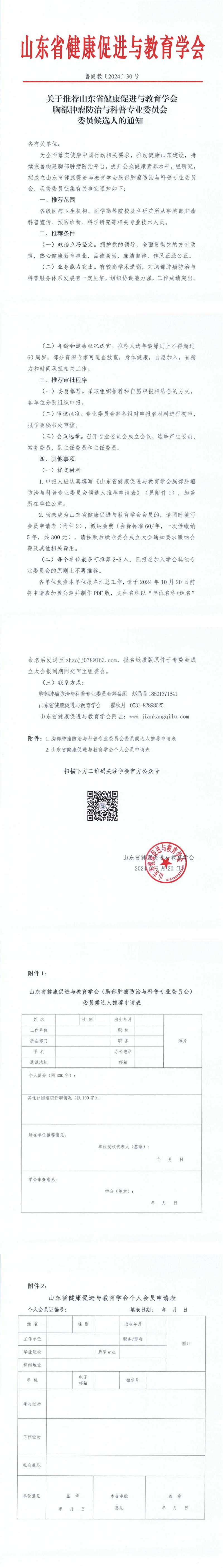 为全面落实健康中国行动相关要求,推动健康山东建设,持续完善构建胸部肿瘤防治平台,提升公众健康素养水平。经研究,拟成立山东省健康促进与教育学会胸部肿瘤防治与科普专业委员会,现将委员征集有关事宜通知如下: