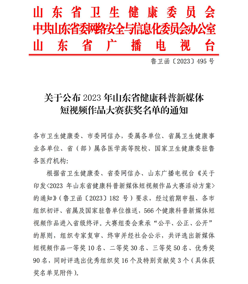 关于公布2023年山东省健康科普新媒体短视频作品大赛获奖名单的通知