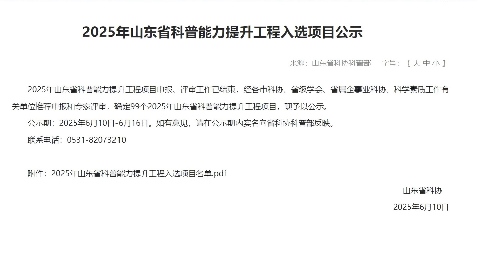 近日,山东省科学技术协会发布了《2025年山东省科普能力提升工程入选项目公示》,我会推荐青岛市疾病预防控制中心《强科普,惠健康--疾病预防控制系列健康微短剧合集》成功入选2025年山东省科普能力提升工程项目。