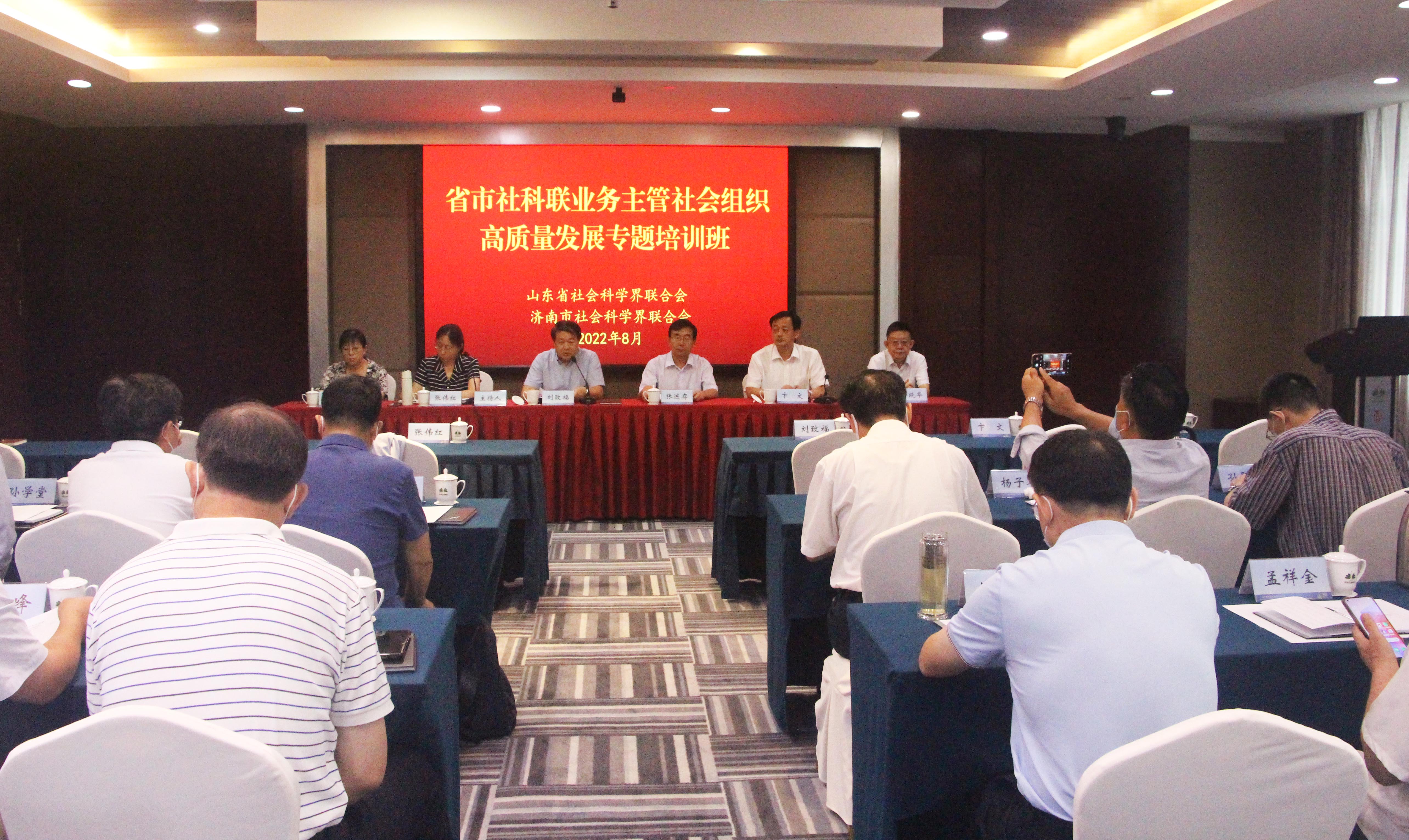 8月25日至26日,由山东省社科联、济南市社科联共同举办的业务主管社会组织高质量发展培训班在济南市莱芜区举办。省社科联党组书记、副主席刘致福出席开班式并讲话,省社科联党组成员、副主席张伟红出席并主持开班式,济南市社科联党组书记、副主席卞文出席开班式并致辞,省社科联二级巡视员徐青、济南市社科联二级巡视员李晓华出席开班式。 刘致福在讲话中回顾总结了近年来省市社科类社会组织所取