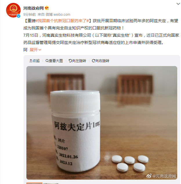 阿兹夫定是全球首个双靶点抗艾滋病创新药,已在中国、美国等多个国家申请专利并获授权。作为一款抗病毒小分子口服药,阿兹夫定具有广谱抑制RNA病毒复制的作用,新冠病毒同属以RNA作为遗传物质的病毒,经临床试验证明,该药对新冠病毒有良好抑制作用。