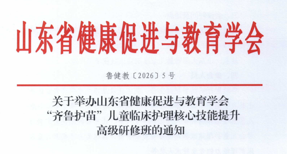 各有关单位:为深入贯彻《中国儿童发展纲要(2021—2030年)》文件精神,加强儿科护理人才培养,经研究决定,山东省健康促进与教育学会联合山东大学附属儿童医院于2026年4月共同举办首期“齐鲁护苗”儿童临床护理核心技能提升高级研修班。现将有关事项通知如下:关于举办山东省健康促进与教育学会“齐鲁护苗”儿童临床护理核心技能提升高级研修班的通知.doc关于举办山东省健康促进与教育学会“齐鲁护苗”儿童临床