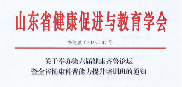 各专委会(分会)及会员:为全面提升医疗卫生人员健康科普工作水平,打造高素质专业化的健康科普队伍,经研究,定于2025年12月25-27日在济南举办第六届健康齐鲁论坛暨全省健康科普能力提升培训班,现将有关事宜通知如下:关于举办第六届健康齐鲁论坛暨2025年全省健康科普能力提升培训班的通知.doc关于举办第六届健康齐鲁论坛暨2025年全省健康科普能力提升培训班的通知.pdf